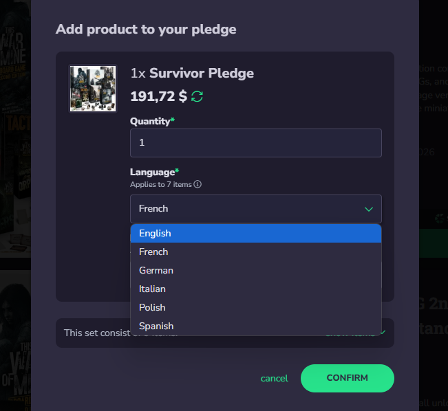 While adding the pledge, please choose the language version you want. This will also apply to all the unlocked stretch goals. You only choose it once, and Gamefound already includes the same language version in the stretch goals.
